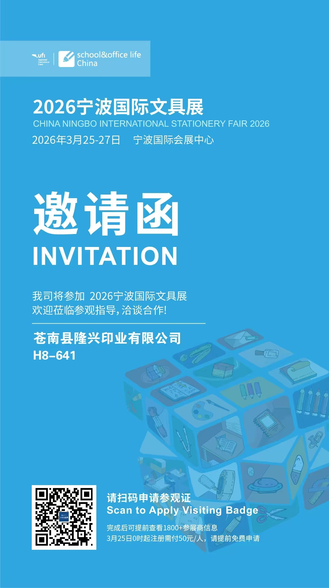 Cangnan County Longxing Printing Co., Ltd. is excited to announce its participation in the 2026 China Ningbo International Stationery Fair, taking place from March 25 to 27, 2026, at the Ningbo International Convention and Exhibition Center.